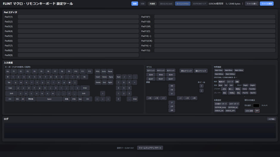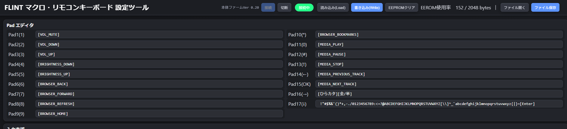 - EEPROMクリア: 本体の設定領域(マクロ)を消去します(画面のPad欄も空になります)