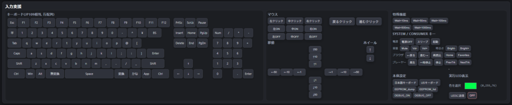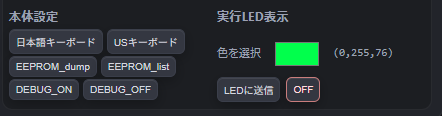 LAYOUT_JP/US、EEPROM_dump/list、DEBUG_ON/OFF - 実行LED表示: LED色(