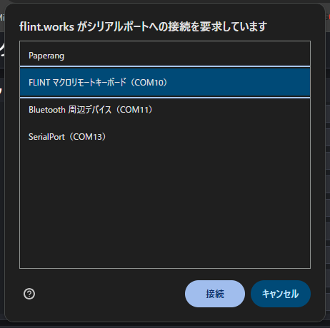 3) ポート選択ダイアログで、「FLINT マクロリモコンキーボード(COM?)のシリアルポートを選ぶ
