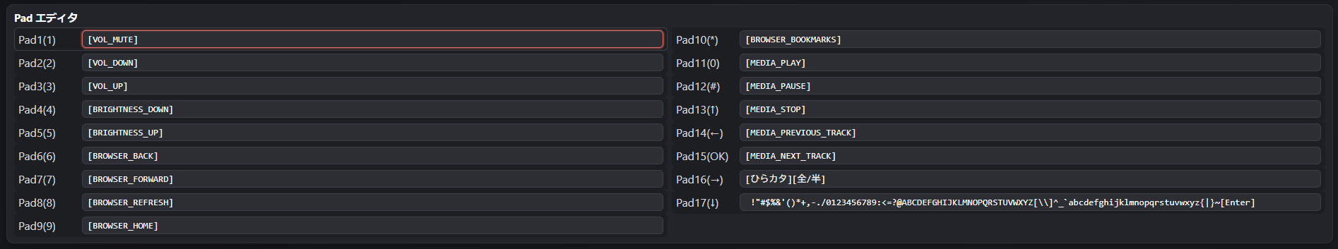 - Pad エディタ: Pad1~Pad17 の入力欄。ここに「動作」を文字列で記述します